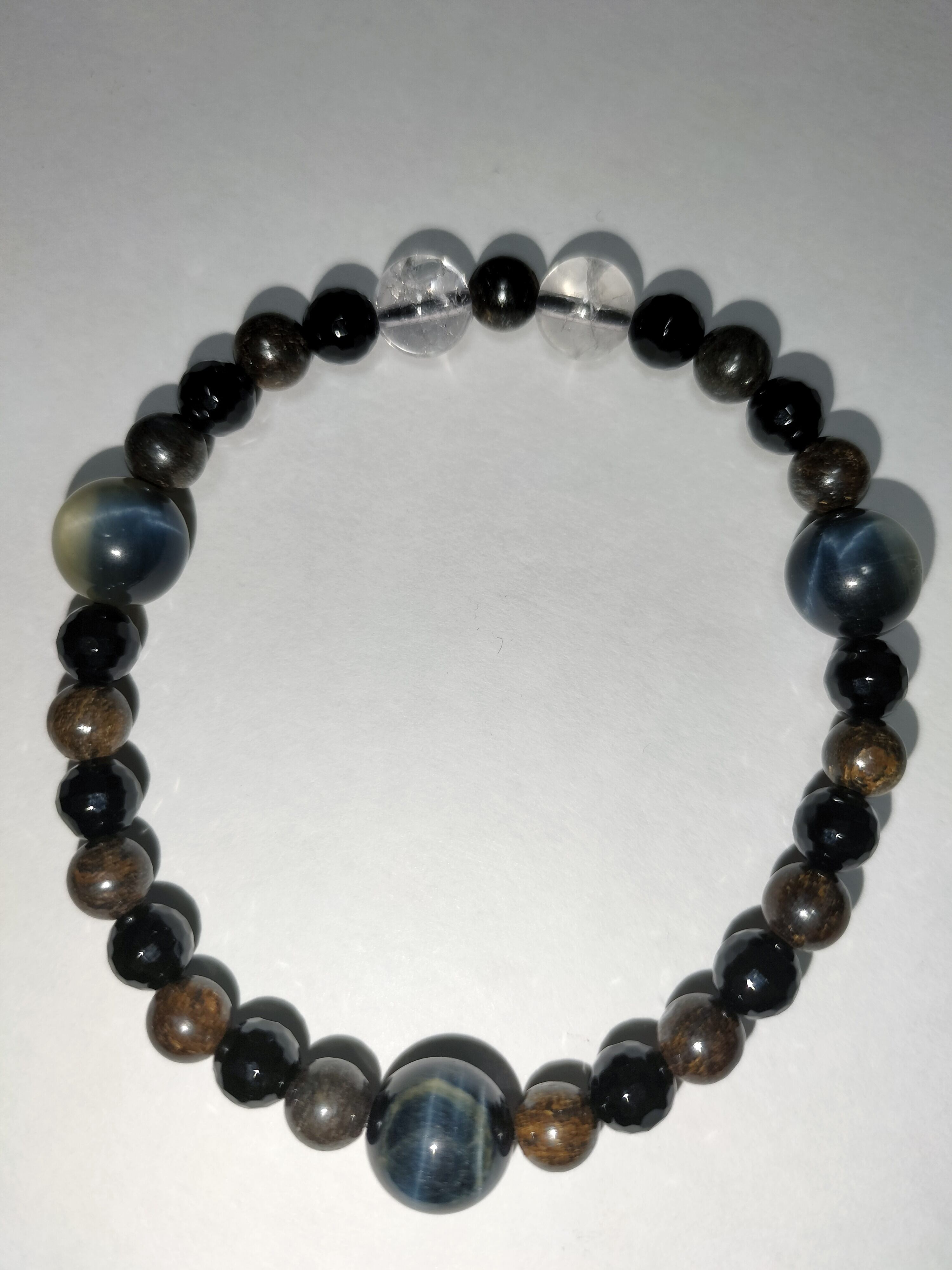 ■ 恵みのエネルギーを感じる!パワーストーンには、あなたの心に平和とポジティブなエネルギーをもたらす力がこめられています!選び抜かれた天然石が組み合わさり、美しいデザインに仕上げています。特に注目したいのは、ホークスアイ、ツートンタイガーアイ、クラック水晶、カットオニキス、カットオニキス、ブロンザイトの6種類!これらの石は、心のバランスを保ちながら、幸運を引き寄せるお手伝いをしてくれます。